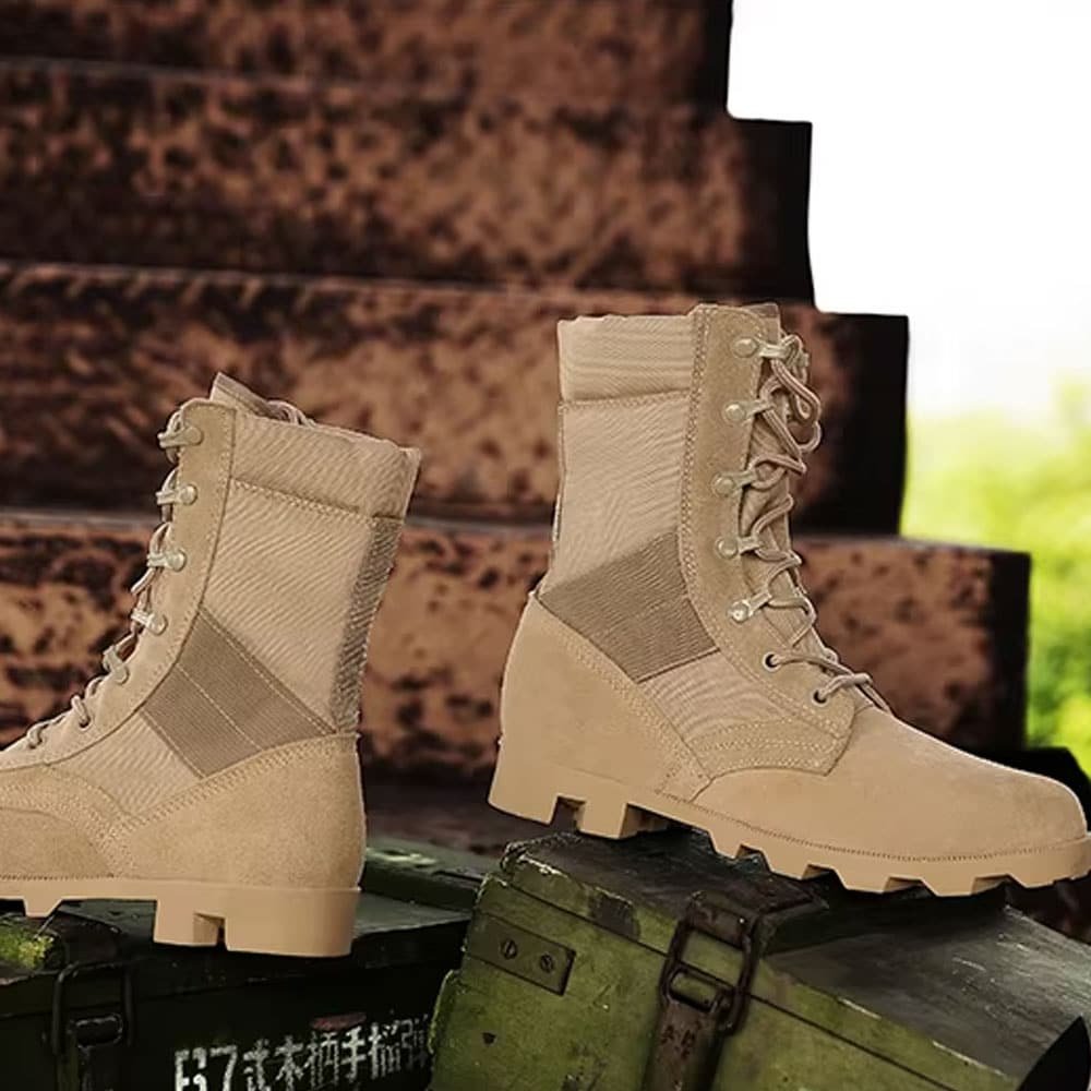 Affrontez le désert en toute confiance avec nos Bottes de combat désert sable. Fabriquées en suède de vache résistant et doublées de coton respirant, ces bottes mi-mollet offrent un confort et une protection incomparables. Leur semelle en caoutchouc robuste garantit une adhérence supérieure sur les terrains accidentés, faisant d’elles votre allié idéal en conditions extrêmes.