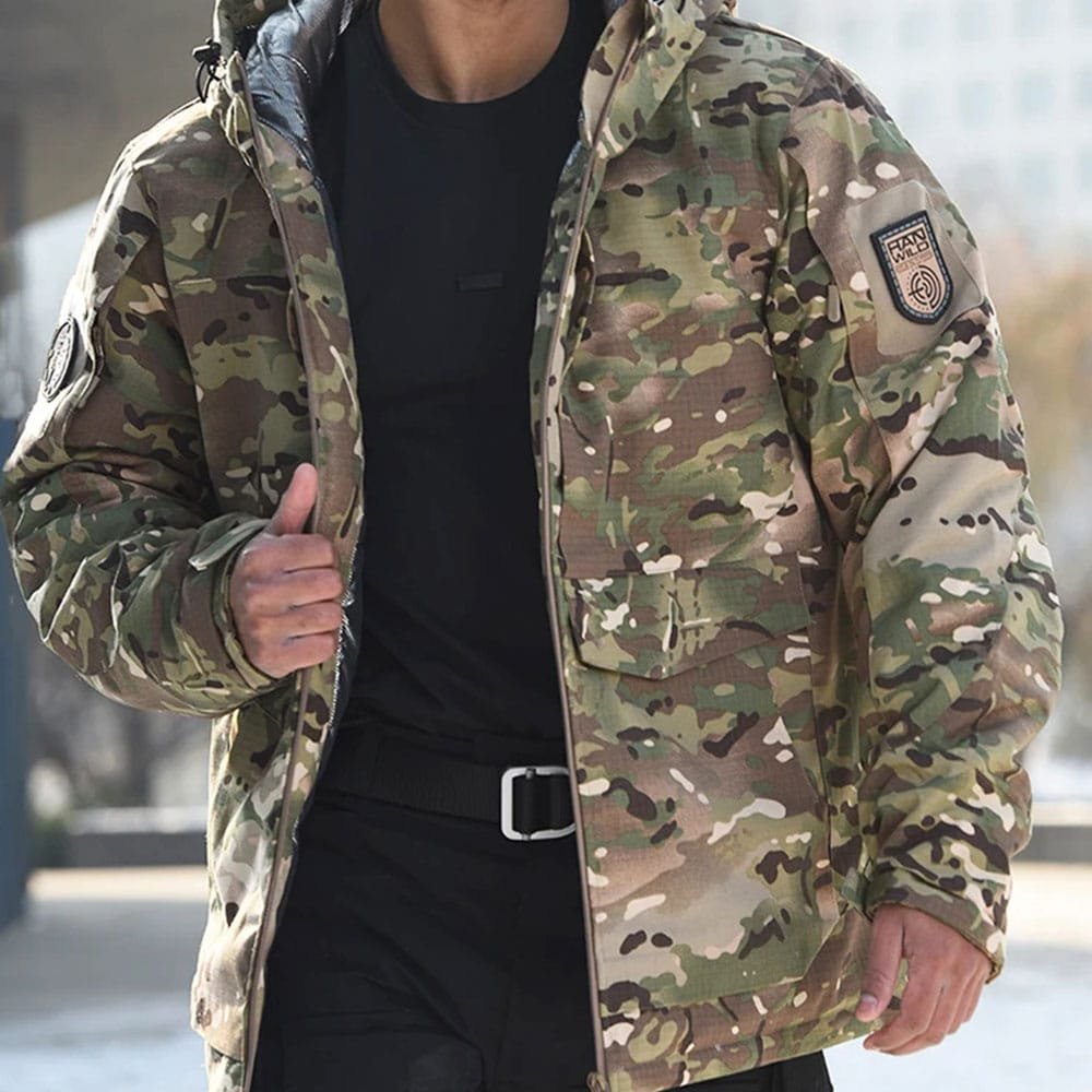 Idéale pour le camping hivernal et la randonnée, cette veste camouflage à isolation thermique vous protège efficacement grâce à sa couche extérieure imperméable et sa doublure intérieure qui conserve la chaleur. Adaptée aux hommes comme aux femmes, elle offre de multiples poches et des poignets Velcro ajustables pour un confort et une praticité optimaux.